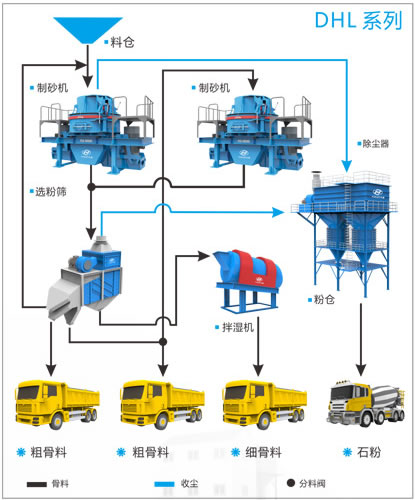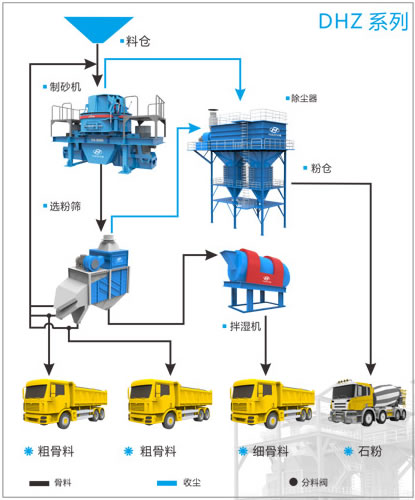 DHZ系列平面站式制砂生產線,結構簡單,可靠耐用,生產效率高。生產的精品機制砂粒型圓整、顆粒級配連續、細度模數可調,該生產線采用多點集中除塵,有效控制粉塵排放。