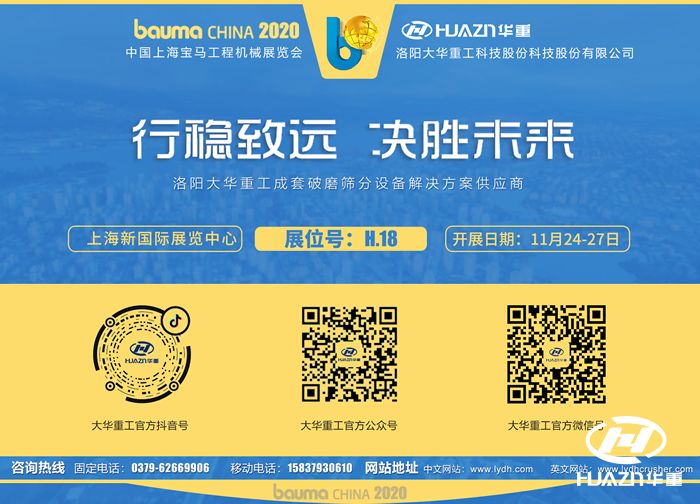 bauma CHINA 2020(上海寶馬展)將于2020年11月24-27日如期舉辦,歡迎大家前來咨詢了解制砂生產線,洛陽大華重工在上海新國際博覽中心H.18靜候您的光臨!