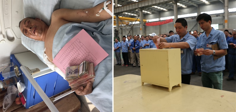 2016年5月14日,我洛陽大華重機公司機加車間段慶坤同志在上班路上遭遇車禍,生命危在旦夕,公司黨支部、工會在得知消息后為段慶坤同志送去了一部分慰問金,同時在得知段慶坤家庭特別困難時,黨支部、工會在公司范圍內提出倡議為段慶坤同志募集愛心善款,倡議一經發出就得到了大華重工總公司及各分公司的積極響應,僅僅兩天共募集善款24860元!當段慶坤同志接過這筆凝聚著大華重工員工愛心善款時,激動不已,表示要積極配合治療爭取早日回到工作崗位,回到這個團結友愛的大家庭中!