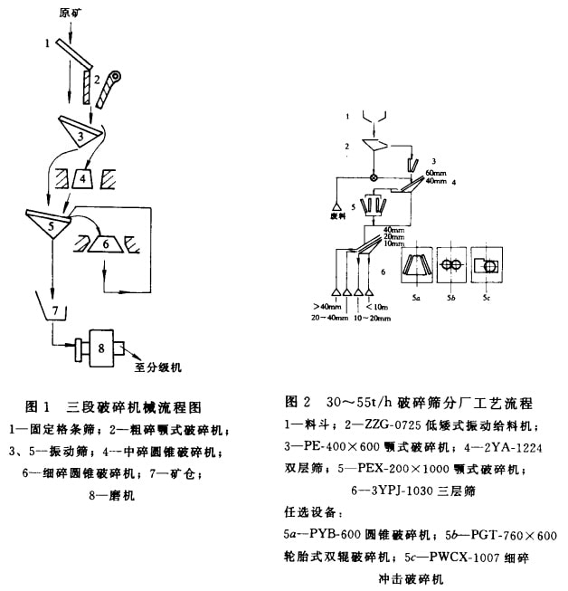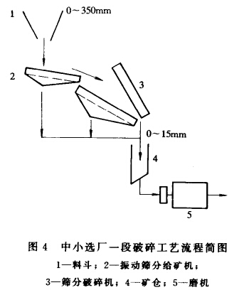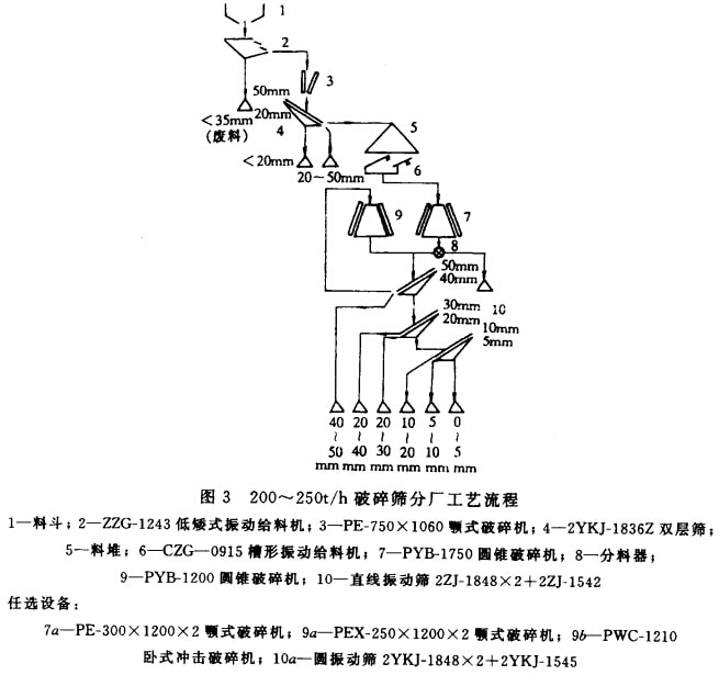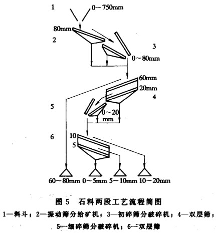 圖4為中、小選廠采用篩分破碎機一段破碎的工藝流程簡圖;圖5為采用兩臺篩分破碎機將最大750mm的石料破碎成4種粒度的兩段破碎的工藝流程簡圖。