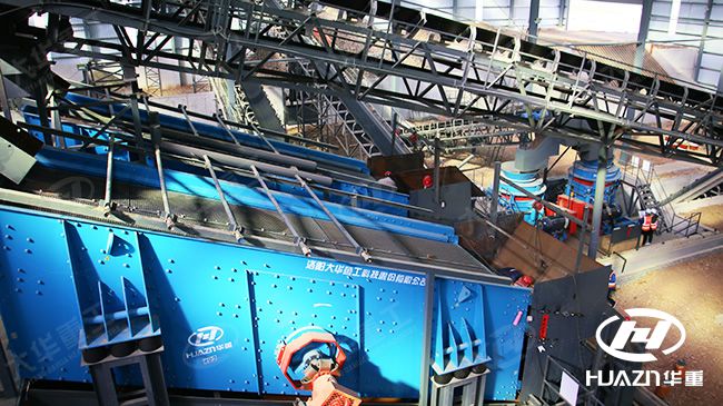 大華重機——400t/h河卵石生產線,整條生產線分別為給料單元、粗碎單元、中碎單元、細碎單元、篩分單元、洗砂單元、污水處理單元。由于砂石原料大小不一,進料口采用兩級給料方式,不會產生棄料,提高了產品的經濟效益。生產工藝中設計有臨時緩沖料堆倉和制砂調節倉各一個,可以分別處理天然砂和機制砂石,分別開機運行,獨立運行。