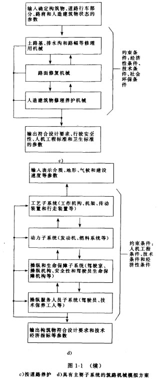 筑路機械由許多主要子系統組成(圖1-1d):工藝于系統(工作機構和行走裝置);動力子系統(發動機);操縱和生命保障于系統以及操作人員子系統。筑路機械主要特殊的標志是具有可以周期作業和連續作業的專用工作機構。為了布置工作機構,筑路機械應具有原結構的機架。為此,廣泛應用載重汽車和拖拉機的標準底盤或輪式牽引車。路面鋪筑作用的綜合機械化和自動化是基丁多種通用建筑機器和專用筑路機械合理的組合。