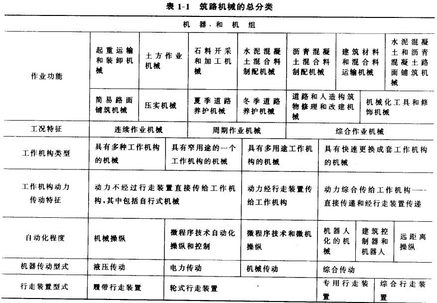 筑路機械根據機器和工作機構作業和結構特征的總分類列于表1-1。