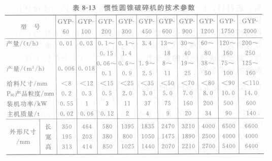 表8-13為慣性圓錐破碎機的技術參數,表8-14為慣性圓錐破碎機破碎非金屬礦的實例。