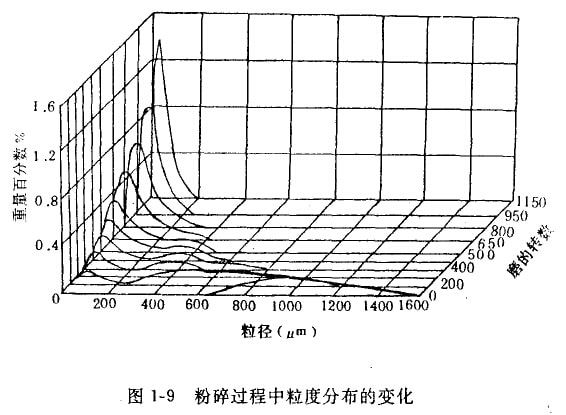 為此海伍德(Hey—wood)在一個小磨機中做研磨煤的一系列實驗,其結果如圖1—9所示。其中產品顆粒粒度的分布以磨機累積轉數的函數表示。原始的粒度分布顯示小一個單峰型,它相當于比較粗的顆粒。當粉碎比逐步增加時,這峰型就逐漸減小并且在一特定的粒度產生第二個峰型。這過程一直進行到第一個峰型完全消失時為止。第二個峰型是物料的特征,稱為持久峰型,而第一個蜂型稱為暫時峰型。