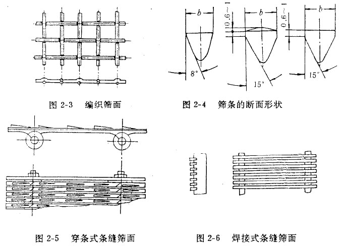條縫篩面的結構型式有穿條式(圖2—5),焊接式(圖2-6)和編織式(圖2—7)三種。