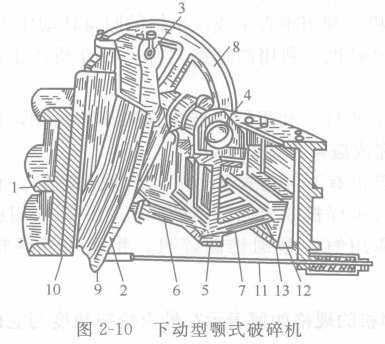 它是由下列主要部件構成:固定顎板又是機架的前壁1,懸掛在軸3上的可動顎板2,偏心軟4,垂直連桿5,肘板6及7,傳動飛輪8,兩顎板上的襯板9、10,帶有彈簧的拉桿11,肘板座12,調節塊13。