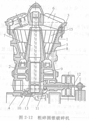 粗碎圓錐破碎機(旋回破碎機)的剖面圖如圖2—12所示。