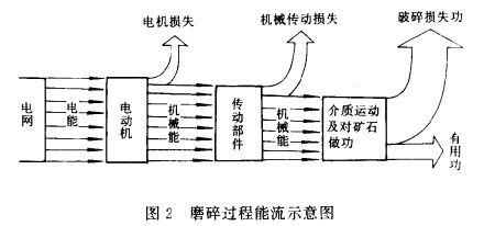 如圖2所示,磨礦過程中有三次大的能量損失。第一次能量損失是電動機將電能轉變為機械能時產生的。該損失的大小取決于電動機的效率,按目前電動機的制造水平,效率一般為90%-95%,電動機損失約占總能耗的5%-10%,這部分損失較小,也難于降低,此環節上節能潛力不大。第二次能量損失是從電動機輸出的機械能經傳動系統而轉變為磨礦介質的機械能時產生的。該損失大小取決于傳動效率高低。按目前的機械制造水平,這部分損失通常占總能耗的10%-15%。多年來曾搞過以滾柱軸承代替滑動軸承、采用液力靜壓軸承和采用環形馬達直接傳動等辦法,但此部分能量損失比例不大,節能的效果有限,節能潛力也不大。第三次能量損失是介質的機械能轉變為礦石的表面能時