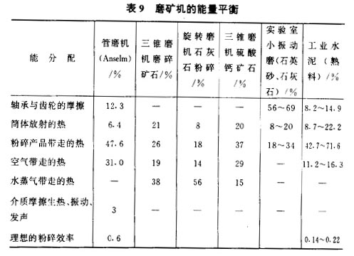 產生的。經前面兩次能量損失后,轉變為介質的機械能時還有75%-85%的總能量。這樣多的能量用于破碎礦石,一部分成為有用功,另一部分成為破碎損失功。目前的測試技術無法測出破碎損失功,也就無法知道有用功的比例。但各種測試和研究說明,破碎損失功相當大,有用功特別是產生礦石新表面積的能相當少,少到可以忽略不計的程度。有的學者研究說明,用石英磨碎的資料計算時僅只輸入功的0.3%用于增加表面積。筆者也作了一個偏 高的計算:固體表面能不大,約(0.0124~0.5) ×10J/cm2,而一般磨礦細度下物料的比表面積通常只有3000~4000cm2/g,如果礦石由破碎產品磨碎到0.074mm時能耗取40kW • h/t,則可算得物料新生表面能充其量只占總能耗的1. 39%。這均是按偏高值算的,也仍然很小?梢,有用功占的比例確實少,絕大部分能量幾乎全變為磨碎損失功。這些磨碎損失功通過摩擦而轉變為熱能散失在介質空間。濕式磨機排礦口出來的液液溫度比給礦高出10℃以上就是證明。國外有人作過磨礦機的能量平衡研究,也證實物料、磨礦介質與襯板間相互摩擦產生的熱量占磨礦過程能 量損失的絕大部分,詳見表9所示。