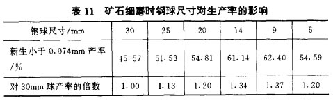 (2)磨碎作用是通過介質實現的,介質尺寸選擇恰當與否對 磨碎過程影響很大。介質尺寸過大,打擊次數過少,過大的破碎 力又往往發生貫穿破碎,同時研磨面積小,研磨能力弱。介質尺 寸過小,破碎能量不足,一次實現不了破碎時礦粒接受的變形能 又作彈性恢復而使能量損失。礦粒經多次破碎力作用而達到疲勞極限時也能破碎,但破碎概率低。當球徑和礦石粒度相適宜時,破 碎力作用精確,破碎作用往往從結合力弱的晶介面上破裂,既節省能耗又增加礦物解離的選擇性。表11舉出礦石細磨(處理物料粒度0. 3mm)下介質尺寸對小于一0. 074mm產率的影響,說明過大過小的球徑細磨效率均低,尺寸恰當時效率才最高。