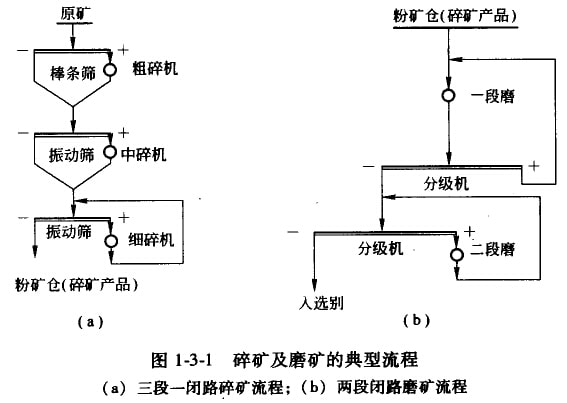 在圖1-3-1中列出三段一閉路的碎礦流程及兩段閉路的磨礦流程為示范。