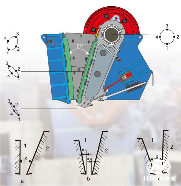 顎破動顎的運動軌跡,如下圖所示,活動顎板在運動過程中,其表面每個點都畫出了一個橢圓,順序是從1-2-3-4運動,可以簡單認為從1到3是動顎擠壓物料破碎過程,從3到1是動顎回程落料過程,在位置3時,動顎有向下的運動趨勢,能夠促進物料下落,這一點也是為什么說復擺顎破產量高的原因。動顎板運動的橢圓軌跡,可以近似看做是水平行程和垂直行程的矢量和,對破碎有效的是水平行程,垂直行程更多的是加速了顎板的磨損。