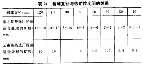 許多選礦廠出于省事,而且對鋼球尺寸在粗磨礦中所起的作用認(rèn)識不足,磨機(jī)裝球直接參照一些書中所列出的經(jīng)驗球徑(表21所示)。表中的球徑值與表19所列的國外選礦廠粗磨球徑相比,這些經(jīng)驗球徑明顯是偏大的。主要原因在于這些經(jīng)驗球徑來源于五六十年代選廠磨礦實踐,而當(dāng)時的磨機(jī)直後均較小,只能以鋼球重量來彌補(bǔ)勢能的不足。而現(xiàn)在選廠多采用大直徑磨機(jī),所以直接采用經(jīng)驗球徑誤差也是較大的。