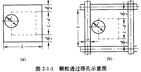 研究單顆礦粒透過篩孔的概率如圖2—1—l所示。假設有一個由無限細的篩絲制成的篩網,篩孔為正方形,每邊長度為L。如果一個直徑為d的球形顆粒,在篩分時垂直地向篩孔下落。可以認為.顆粒月篩邀不相碰時.它就可以毫無阻礙地透過篩孔。換言之,要使顆粒順利地透過篩孔,在顆粒下落時,其中心應投在紋有虜線的面積(L—d)²內(圖2—1—1a)。