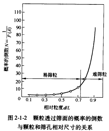 取不同的今比值計算出的P和N值,見表2—1—1。利用這些數據可畫出圖2—14的曲線。曲線可大體劃分為兩段,在顆粒直徑d小于0.75L的范圍內,曲線較平緩,隨著頹粒直徑的增大,顆粒透過篩面所需的篩孔數目有所增加。當顆粒直徑超過0.75L以后,曲線較陡,顆粒直徑稍有增加,顆粒透過篩面所需的篩孔數目就需要很多。因此,用概率理論可以證明,在篩分實踐中,把d<0.75L的顆粒稱為“易篩粒”和d>0.75L的顆粒稱為“難篩粒”是有道理的。