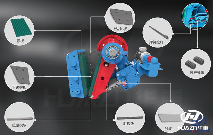 對于顎式破碎機來說其易損件主要有活動顎板、固定顎板、襯板、肘板、偏心軸和軸承等。在實際的生產過程中,易損件的非正常磨損除了與設備的結構缺陷有關,還與物料的硬度過大、物料的粒度過粗、設備潤滑效果不理想以及環(huán)境因素等有關。