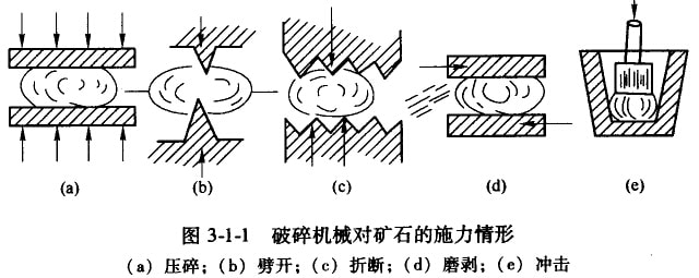 機械破碎法是靠破碎機械的施力來完成的,破碎機械的施力方式不外是壓碎、劈開、折斷、磨剝及沖擊等,如圖3-1-1所示。