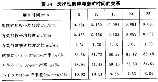 (8)隨粒度變細(xì),各種礦物的選擇性破碎現(xiàn)象減弱。隨顆粒粒度的變細(xì),礦物強(qiáng)度增加,軟硬礦物的磨碎速度開始趨于一致, 表48的數(shù)據(jù)已說明此點(diǎn),K值隨磨礦時(shí)間的延長逐漸趨向于1。 表54所示為選擇性磨碎現(xiàn)象與磨碎時(shí)間的關(guān)系。結(jié)果說明:隨磨礦時(shí)間的延長,礦物顆粒變細(xì),軟硬兩種礦物的平均粒度差變小,磨碎時(shí)間足夠長時(shí),二者粒度可達(dá)到相同;軟硬兩種礦物小于0. 074mm產(chǎn)率差隨磨礦時(shí)間的延長而減少,而且時(shí)間愈長產(chǎn)率差值愈小,即粗磨下選擇性磨碎現(xiàn)象顯著,而細(xì)磨下選擇性磨碎現(xiàn)象逐漸減弱。造成這一現(xiàn)象的原因是礦物隨粒度減小強(qiáng)度增大,礦物之間強(qiáng)度差縮小,選擇性磨碎現(xiàn)象減弱。