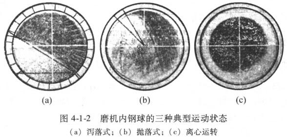 磨內(nèi)鋼球的狀態(tài)是一個(gè)變量狀態(tài)函數(shù),使鋼球狀態(tài)很難用數(shù)學(xué)手段量化確定。它的運(yùn)動(dòng)狀態(tài)依變量參數(shù)而變,變量參數(shù)種類數(shù)多,則鋼球狀態(tài)也紛繁。而且不少因素對(duì)狀態(tài)的影響目前還難于用函數(shù)關(guān)系表達(dá)出來。有研究者拍攝了磨內(nèi)的球荷的運(yùn)動(dòng)狀態(tài),從中選出三種典型運(yùn)動(dòng)狀態(tài),見圖4-1-2。