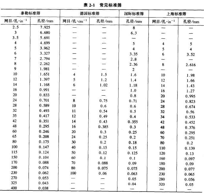 此外,還有英國(guó)B.S系列標(biāo)準(zhǔn)篩。我國(guó)標(biāo)準(zhǔn)篩的篩制尚未公布,常用的上海篩類(lèi)似泰勒篩。 各種標(biāo)準(zhǔn)篩見(jiàn)表2-1,我國(guó)常用的上海篩也列入表中以供參考。
