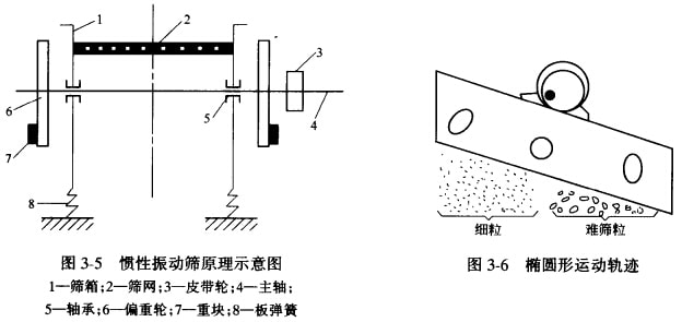 慣性振動篩是由于偏重輪的回轉運動產生的離心慣性力(稱為激振力)傳給篩箱,激起篩子振動,篩上的物料受篩面向上運動的作用力而被拋起,前進一段距離后再落回篩面,直至透過篩孔。