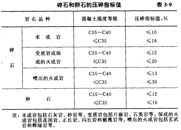 碎石或卵石須具有足夠的強度,以保證混凝土的強度要求。碎石的強度可用巖石的抗壓強度和壓碎指標值表示。巖石的抗壓強度與混凝土強度等級之比不應小于1.5,且火成巖強度不宜低于80MPa,變質巖不宜低于60MPa,水成巖不宜低于30MPa;炷翉姸鹊燃墳镃60及C60以上時應進行巖石抗壓強度檢驗,其他情況下如有懷疑或認為有必要時,也可進行抗壓強度試驗。巖石的抗壓強度首先應由碎石生產供應單位提供檢驗報告。工程中經常性的質量控制,可用壓碎指標值檢驗控制碎石的強度,碎石的壓碎指標值宜符合表3-9的規定。