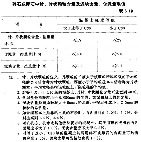 碎石或卵石中針片狀顆粒含量及泥塊含量、含泥量應符合表3-10的規定。