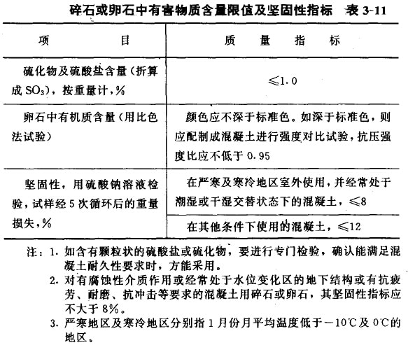 碎石或卵石的堅固性,硫化物和硫酸鹽含量以及卵石中有機雜質含量應符合表3-11的規定。
