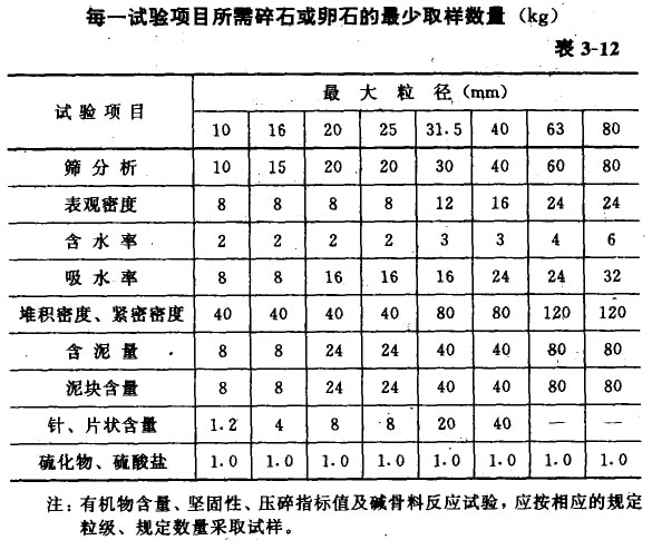 每一單項試驗的試祥應不少于表3-12所規定的最小取樣數量。須作兒項試驗時,如確能保證試樣經一項試驗后不致影響另一項的試驗結果,可用同一批試樣進行幾項不同的試驗。