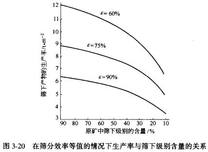 被篩物料的粒度組成,對于篩分過程有決定性的影響,在任何情況下,細粒總是比粗粒容易通過篩孔。因此,當物料中細級別含量增大時,篩子的生產率也隨之顯著增大。圖3-20所示曲線表示不同篩分效率時的生產率(按篩下產物計算)與原料中細粒級含量之間的關系。由圖可以看出,當原物料中篩下級別的含量由10%增加到90%時,篩子的生產率幾乎增大一倍。這是因為,當篩下級別含量大的物料給入篩面時,細粒很迅速地通過篩孔,而留在篩上的物料就很少了, 此時,即使在篩上物料中還有一些"難篩粒",相對地比較容易通過篩孔,因為其他礦粒對它們的影響小。反之,當原物料中篩下級別含量少時,因為整個篩面幾乎被篩上產物所占據,妨礙了細粒通過篩孔,因此,在保證篩分效率相等的條件下,按給礦量計算的生產率也就降低了;所以當原物料中細級別含量少,而粗級別的粒度又比篩孔尺寸大得多的時候,為了提高篩子的生產能力和延長篩網的使用壽命,可以采用增加輔助篩網的方法,用篩孔尺寸較大的輔助篩網,預先篩除篩上產物過粗的級別,然后用下層篩網對含有大量細級別的物料進行最終篩分,此時,雙層篩作單 層篩使用,只接兩個產品。