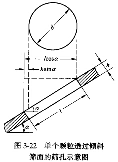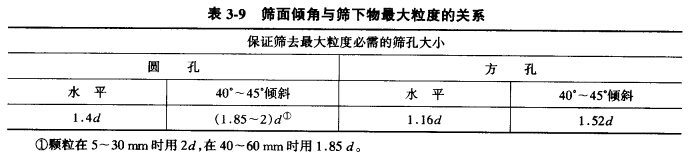 一般情況下,篩子是傾斜安裝的,以便于排出篩上物料。傾角大小要合適,傾角過小,物料在篩面上運動速度太慢,雖然篩分效率高,但篩子的生產率減小;反之,傾角太大,物料排出太快,篩分效率降低。當篩面傾斜安裝時,可以讓顆粒順利通過的篩孔尺寸只相當于篩孔的水平投影,如圖3-22所示。能夠無阻礙地透過篩孔的顆粒直徑等于d = Icosa - hsina,式中I為篩孔尺寸,h為篩面厚度,a為篩子的傾角。由此可見,篩面的傾角愈大, 使顆粒通過時受到的阻礙愈大。因此,篩面的傾角要適當。表3-9所示為篩面的傾角與篩下物最大粒度及篩孔尺寸的關系。