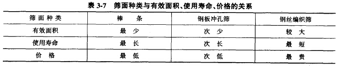 篩子的工作面通常有三種:鋼棒(或條)制造、鋼板沖孔和鋼絲編織。它們對篩分過程的影響,主要和它們的有效面積有關,見表3-7。