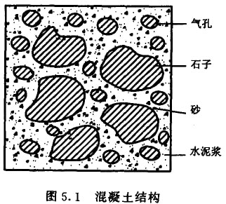 普通混授土是由水泥、砂、石子和水組成。在混凝土中,砂石材料的總含量占總體積的80%以上,主要起骨架作用,稱為骨料;水泥與水形成水泥漿,水泥漿包裹在骨科表面并填充其空隙。在硬化前,水泥漿起潤滑作用,使混援土拌合物具有一定的流動性,以滿足施 工的要求。水泥漿硬化后形成水泥石,將骨科膠組成一個堅實的整體。水泥混凝土的結構如圖5.1。