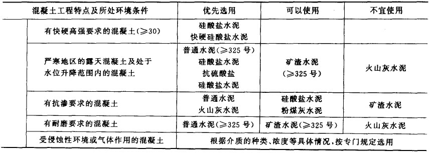 配制混凝土用的水泥,應從工程性質及所處的環境,結合水泥特性綜合考慮。常用水泥品種選用見表5.1。