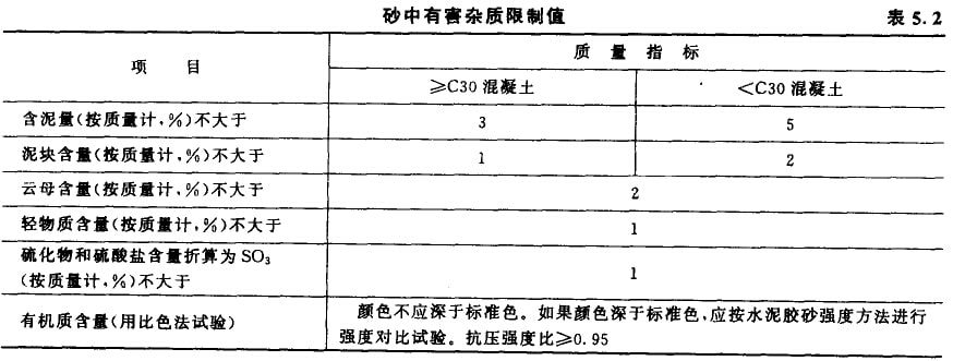 國標JGJ52-92中對砂中有害雜質含量的規定見表5.2。