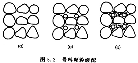 砂的顆粒級配是指不同大小顆粒的砂子組合情況。一般粗細均勻的砂粒,其孔隙率較大,但如果各種粒徑的顆粒搭配恰當,使中等顆粒能填充粗顆粒的空隙,細顆粒又能填充中等顆粒的空隙,就可以使砂子得到較小的空隙率,如圖5.3所示。因此,砂子的空隙率取決于砂料各級粒徑的搭配,級配好的砂子不僅可以節約水泥,還可以提高混凝土的密實性及強度。