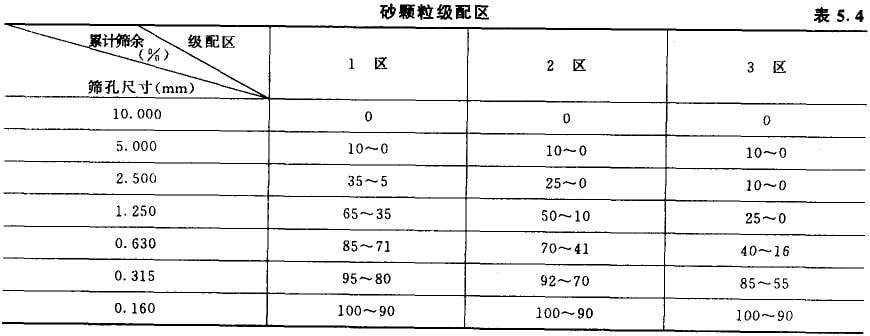 確定砂的級配狀況以級配區為標準,砂的級配區的確定如下:將紉度模數為3.7-1.6的砂,按0.63mm篩孔的累計篩余百分牢劃分為3個區。0.63mm在這里稱為控制粒級,它使任何一種砂樣只能處于某一個級配區范圍內,而不會同時局于兩個級配區,見表5.4所示。