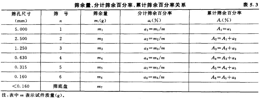 砂的粗細和顆粒級配的判斷有賴于篩分析試驗。篩分析試驗是用一套孔徑(凈徑)為5、2.5、1.25、0.63、0.315及0.16mm的6個標準篩,格500g的干砂試樣由粗到紉依次過篩,然后稱得遺留在各篩上砂子的質量,計算出各篩上的分計篩余百分率(各篩上篩余量占砂樣總量的百分數)及累計篩余百分率(各篩和比該篩粗的所有分計篩余百分串之和)。篩余量、分析篩余百分率、累計篩余百分率的關系見表5.3。