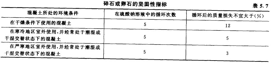 石子的堅固性是指石于在氣候、環境變化或其他物理因素作用下,抵抗碎裂的能力。常用硫酸鈉溶液,將試件經5次循環浸泡后,要求試件質量的損失應符合表5.7的規定。質量損失越少,骨料越堅固,其質量也越好。