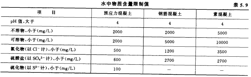 對水質有懷疑時,應將待檢驗水與蒸餾水分別做水泥凝結時間和砂漿或混凝土強度對比試驗。對比試驗測得的水泥韌凝時間差和終凝時間差,均不得超過30min,且其韌凝及終凝時間應符合國家水泥標準的規定。用待檢驗水配制的水泥砂漿或混凝土的28d抗壓強度不得低于用蒸餾水配制的對比試件強度的90%。混凝土用水中各種物質含量限制值見表5.9。