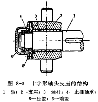 十字形軸頭支座的結(jié)構(gòu)如圖8-3所示。支座兩側(cè)的軸頭支承在傳動(dòng)架上。這種裝置可以滿足螺旋軸在作旋轉(zhuǎn)運(yùn)動(dòng)的同時(shí),又可作升降運(yùn)動(dòng)。