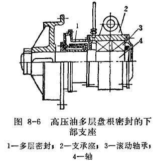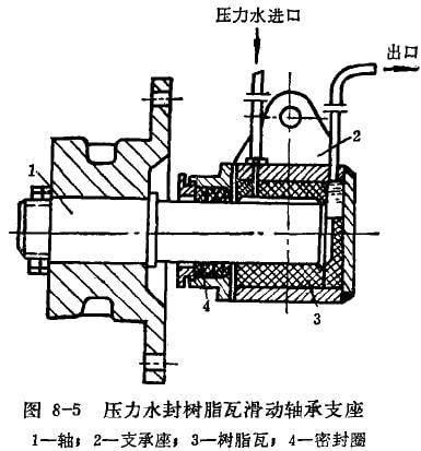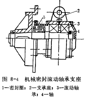 下部支座長期沉沒在礦漿中,因而軸承的密封裝置是保證設(shè)備正常運(yùn)轉(zhuǎn)的關(guān)鍵問題。目前,常用的下部軸承的密封裝置有三種,即機(jī)械密封滾動(dòng)軸承支座(圖8-4)、壓力水封樹脂瓦滑動(dòng)軸承支座(圖8-5)及壓力水封橡膠軸襯(一船用皮帶機(jī)廢肢帶組疊而成)。這些結(jié)構(gòu)型式的密封性均不夠理想,最近,在機(jī)械密封滾動(dòng)軸承支座的基礎(chǔ)上,用手動(dòng)干油泵注入高壓油,壽命可達(dá)1年左右,其結(jié)構(gòu)如圖8-6所示。