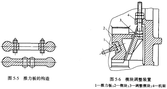 推力板又稱肘板,它是向動顎傳遞運動的一個桿件,同時用它作為保險裝置。改變其長度,還可以調整排礦口的大小。一般用鑄鐵鑄成整體,也有鑄成兩塊的,然后用螺栓或鉚釘連接起來。也有將肘頭和肘身分開制造,如圖5-6所示,然后用媒栓或鉚釘連接起來。