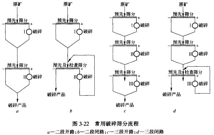 圖3-22a和b分別為二段開路和二段閉路流程。二段開路破碎篩分流程優(yōu)點(diǎn)是較經(jīng)濟(jì),缺點(diǎn)是難保證產(chǎn)品粒度。二段閉路破碎篩分流程能保證產(chǎn)品粒度要求,但成本較前者高。二段破碎篩分流程總破碎比不大,生產(chǎn)能力一般小于100t/d。