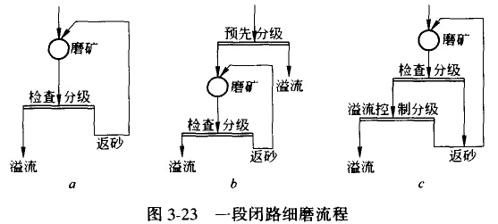 圖3-23a所示為常見的設(shè)有檢查分級(jí)的一段閉路細(xì)磨流程;若原料粒度較細(xì),含合格產(chǎn)品在15%以上時(shí),可采用加預(yù)先分級(jí)的一段閉路細(xì)磨流程(圖3-23b);若對(duì)最終細(xì)磨產(chǎn)品要求比較細(xì)時(shí),可采用加路流控制分級(jí)的一段閉路細(xì)磨流程(圖3-23c)。