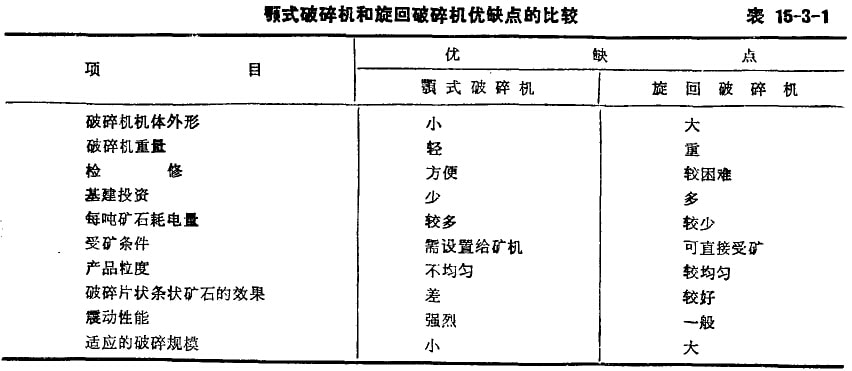 露天礦所用的粗破碎設(shè)備,一般都采用顎式破碎機(jī)或旋回破碎機(jī)。所選用的設(shè)備,必須滿足破碎產(chǎn)品粒度和生產(chǎn)能力的要求,也需考慮給礦中的最大粒度不得大于被碎機(jī)給礦口的0.85倍。顎式破碎機(jī)和旋回破碎機(jī)又各有其優(yōu)缺點(diǎn),故在選擇設(shè)備時(shí)還要根據(jù)具體情況而定,一般礦山規(guī)模較小時(shí)宜采用顎式破碎機(jī)。顎式和旋回的優(yōu)缺點(diǎn)比較見表15-3-1。