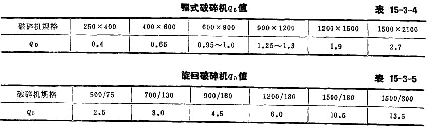 qo——顎式、旋回破碎機(jī)單位排礦口寬度的生產(chǎn)能力,噸/毫米·時(shí),查表15-3-4和表15-3-5;