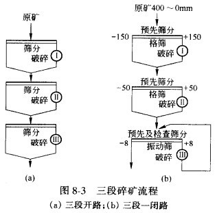 兩段碎礦流程有兩段開路和兩段一閉路兩種,如圖8-2所示,在這兩種流程中,以兩段一閉路流程為最常見。因第二段碎礦與檢查篩分構成閉路,可以保證破碎產品粒度符合要求,為下步磨礦作業創造有利條件。兩段一閉路破碎流程只適用于地下采礦原礦粒度不大或者第二段采用破碎比較大的反擊式碎礦機的情況及小型礦山。