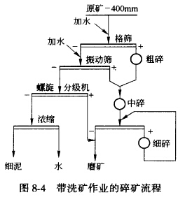因原礦性質不同,洗礦方式及對細泥的處理方法不同,所以流程也是多種多樣的,如圖8-4所示。原礦為矽卡巖型銅礦床,含泥為6%~8%,含水在8%左右,其碎礦流程為三段一閉路。為了碎礦機能安全正常的工作,第一次洗礦在格篩上進行,篩上產物進行粗碎,篩下產物進入振動篩加水沖洗,振動篩的篩上產物進人中碎,中碎后進入第三段閉路碎礦。 振動篩的篩下產物進入螺旋分級機分級脫泥,分級返砂與最終碎礦產物合并進入下一段磨礦。 分級溢流進入濃縮機、緩沖及脫水后,單獨進行礦泥的磨礦和選別。
